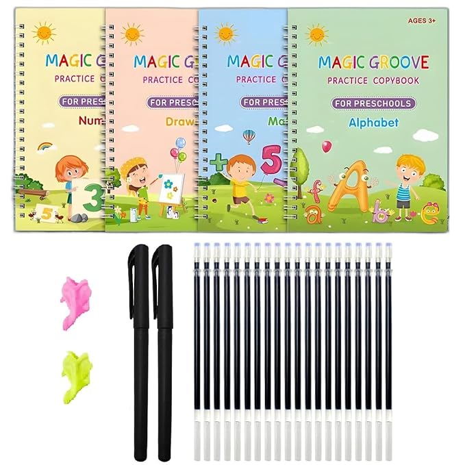 COMFORATBLE WRITING DESIGN: ✎This is a Magic Copybook that can help children improve their handwriting by demonstrating correct posture. It has a silicone pen holder, which facilitates children to master the method of holding pen. The Magic Copybook can help children practice their handwriting and have fun at the same time!